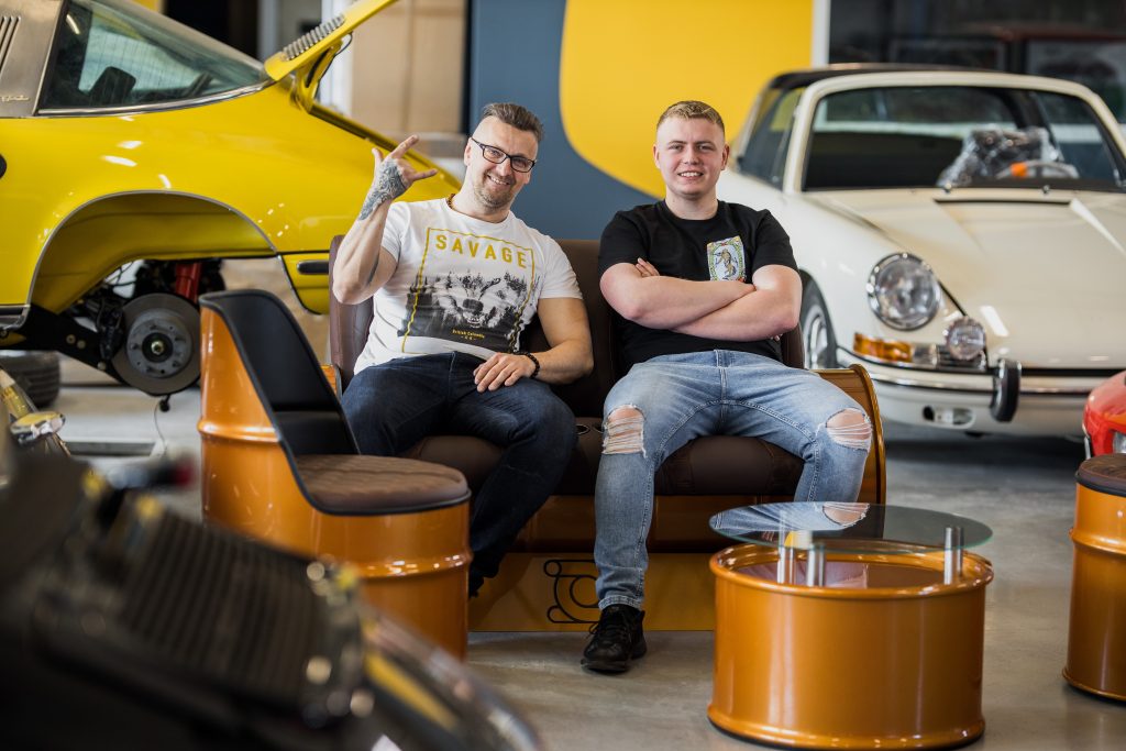 To właśnie wtedy zrodziła się idea tworzenia mebli z wykorzystaniem części samochodowych, łącząc upcycling z nowoczesnym designem. Wkrótce potem Dominik nawiązał współpracę z Tomaszem Rzymskim, znanym również jako FEHUT Tapicer. Ich wspólna pasja i komplementarne umiejętności zaowocowały powstaniem unikalnych, autorskich mebli inspirowanych motoryzacją.
